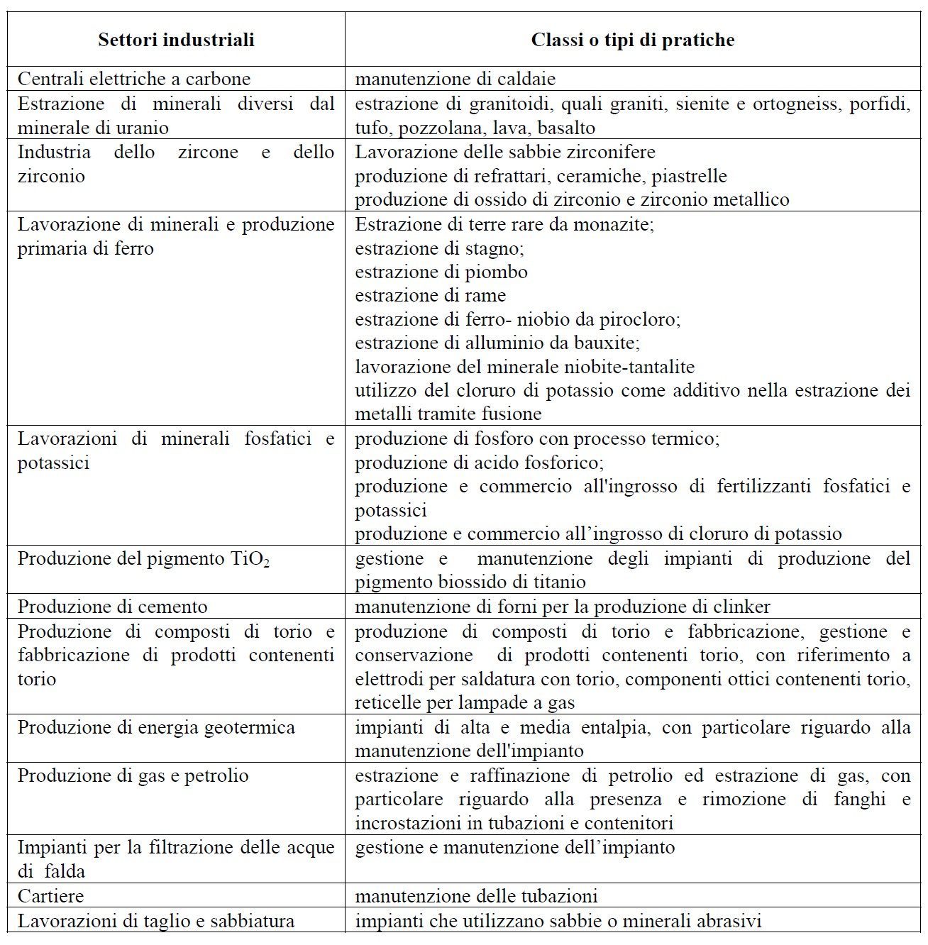 Tralasciando gli elementi di cui al punto 1, in questo articolo tratteremo dei materiali di cui al punto 2. La tabella II-1 riportata all’allegato II del D.Lgs. 101/2020 indica quali sono i settori industriali dove è possibile trovare materiali contenenti radionuclidi naturali in concentrazioni anche significative, e le relative attività che possono comportare esposizione al rischio.